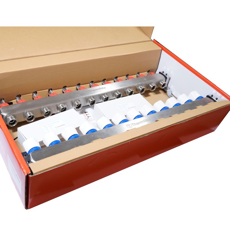 - 8 Zone Dualmix Manifold – Including: Manifold Isolating Valves x 2 – Temperature Gauge x 2 – Lockshields with flow meters on each port – Drain/fill valves with blank cap x 2 – Automatic air vent x 2 – Metal fixing brackets x 2