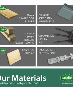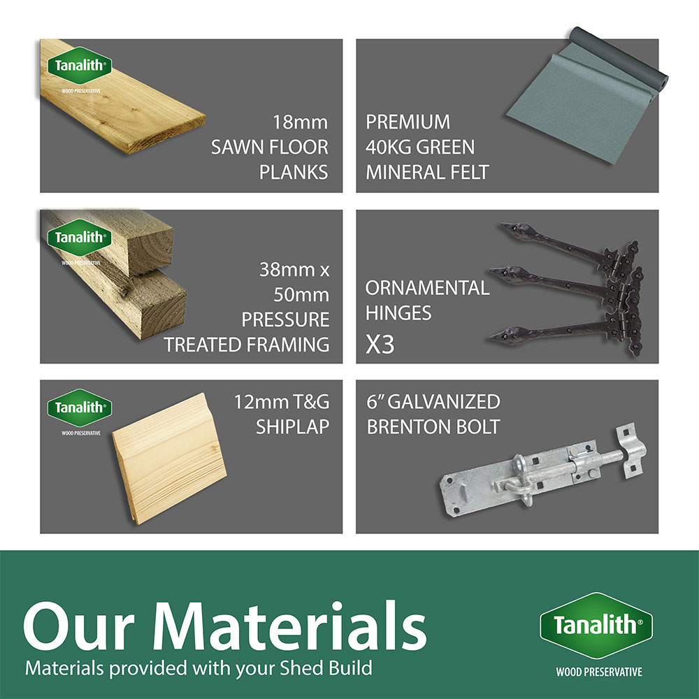 Our buildings only use the finest Timber materials, and we will never use inferior materials such as chipboards or OSB board. This is why we come so highly recommended by past customers, garden centres we currently provide and also high profiled property developers.