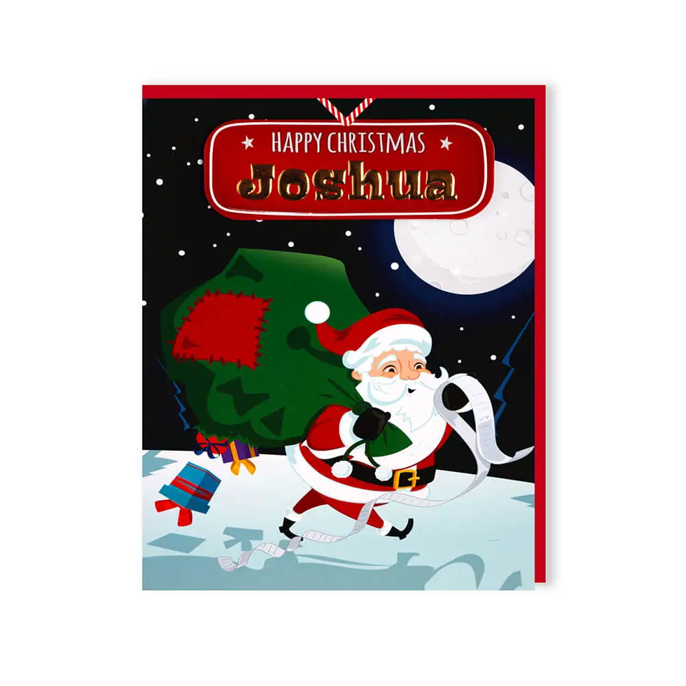 Santa’s on his way with Joshua! Santa’s on his way with these pre-personalised Christmas Cards. With a festive design featuring Santa himself, each pre-personalised name is embossed in gold foil to really emphasise who this card is for.