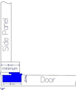 The Blum 33 sprung hinge is used on face frame type cabinets and mounts in a 35mm hole in the back of the cabinet door. The hole depth is 1/2in. The bore distance (distance from the edge of the 35mm hole to the edge of the door) is 1/8in for all applications of this hinge. Door opening angle is 110 degrees.