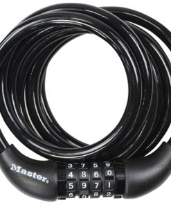 Master Lock 1.8m Self Coiling Combination Cable with a pin tumbler cylinder and a coloured vinyl covering that helps to prevent scratching.