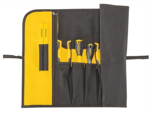 The STANLEY® 1-93-601 Tool Roll is made from durable 600 denier fabric. Contains 12 pockets for various sizes of tools and ties for convenient and safe storage.