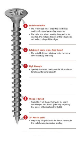 REISSER R2 BZP WOODSCREWS are manufactured to the same specification as the R2 YZP screws to give consistent performance in all timbers and board materials. The 25deg needle point gives the ability to penetrate almost all timbers without a pilot hole and the sharp, wide deep thread with unique lubrication gives up to 40% less driving resistance and easy penetration. Specially hardened steel gives the R2 BZP maximum tensile and torsional strength and the tried and tested R2 thread pattern offers exceptionally high pull out resistance. The deep reinforced pozi drive countersunk head recess allows the best possible fit to the driver bit, reducing cam out and providing extra strength at the critical junction between shank and head. Fully accredited the R2 BZP is available if a wide range of sizes, in full and part thread and in many volume options. Coated in a high quality, traditional Bright Zinc Plated finish the R2 BZP offers a different visual option whilst retaining the Consistency of Quality.