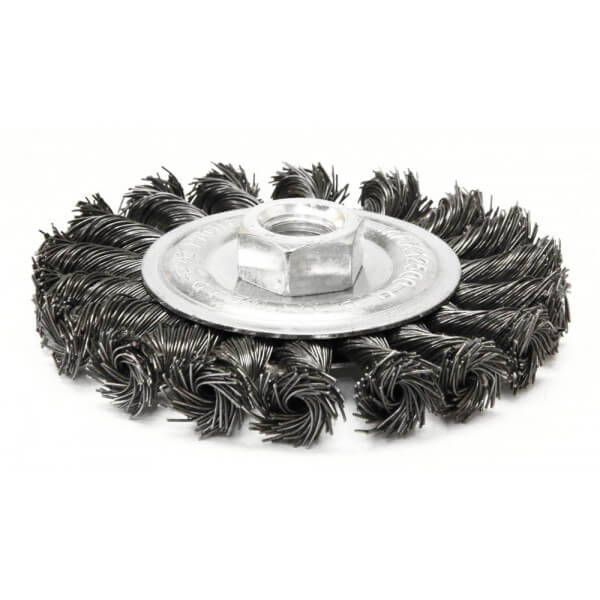 Twist Knot Wire Wheel 100mm diameter with M14 thread. Max 12500 rpm. For use on angle grinders